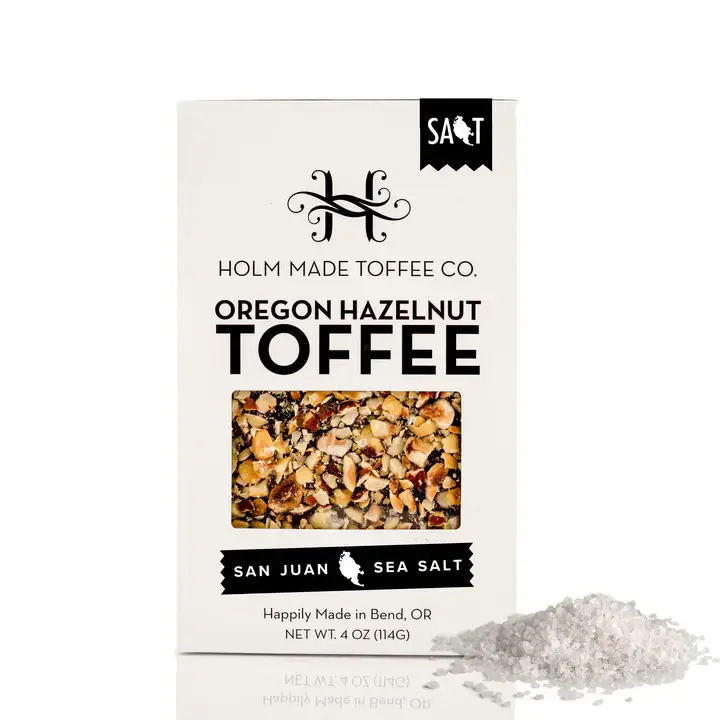 We are so excited to have teamed up with one of our favorite candy companies, Holm Made Toffee Co in Bend Oregon! They make the yummiest toffee we have ever tried and we are so excited to have a taste of our sea salt in their delicious treats! From the folks at Holm Made Toffee Co. “We’ve teamed up with San Juan Sea Salt for our latest collab flavor! This flavor truly melds the best of what the Pacific Northwest has to offer… our Oregon Hazelnuts are enhanced with Washington sea salt! This salt was harvested off of the San Juan Islands using just sunshine and the taste is truly amazing!