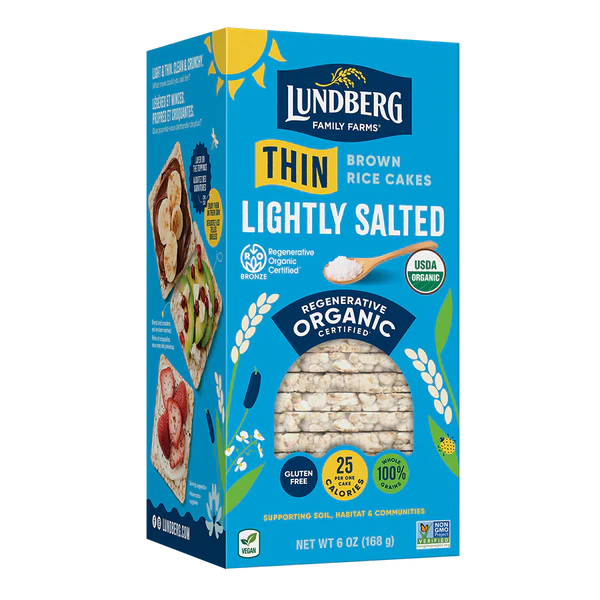 Lundberg Family Farms Lightly Salted Brown Rice Thin Stackers Puffed Grain Cakes offer a delightful crunchy breakfast meal or snack, any time of day. They can be eaten alone, on the run, or choose a favorite complimentary topping and relax with a snack you can enjoy and feel good about eating. These rice cakes are an Organic whole grain food and provide the additional advantage of being Kosher, Non-GMO and Gluten Free. Lightly seasoned with sea salt, these cakes give your body 27g of whole grain per serving. A great addition to a healthy diet.