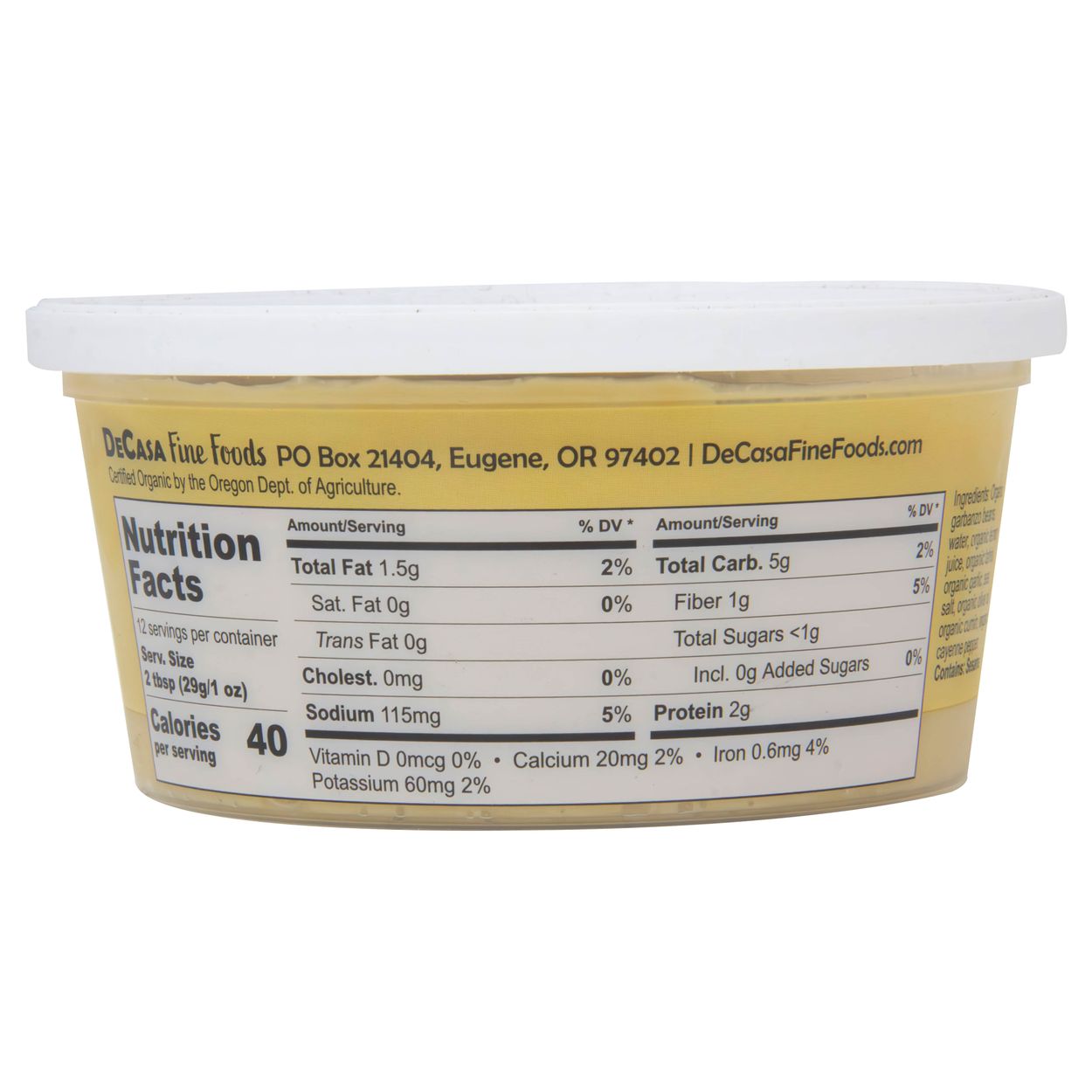 Ingredients: Organic Cooked Garbanzo Beans, Organic Tahini (Ground Sesame Seeds), Organic Olive Oil, Organic Fresh Lemon Juice, Organic Granulated Garlic, Sea Salt, Organic Spices, Citric Acid.
